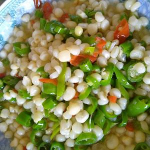 辣椒切小断,起锅烧红油倒入玉米炒2分钟再放入辣椒炒一分钟加入盐炒一会放水煮开加入大蒜味精和均匀即可起锅