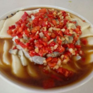 锅内放油,热后把腌制好的辣椒放入爆香,加入少少的鸡精,把炒好的辣椒末到进豆腐上,再放在微波炉里转3分钟就OK啦