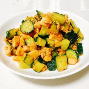 锅中倒油加盐少许,油热后加入蒜瓣儿姜丝炒香倒入鸡丁迅速翻炒,看鸡肉变白点倒入黄瓜丁,➕鸡精等调味品少许,炒个一分钟,最后可以加些番茄酱,没有番茄酱就自己将番茄蒸一下炒成酱加入吃过即可