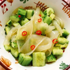 搅拌过程中可以根据个人口味加盐,搅拌匀匀后装盘,既爽口又简单的裸拍黄瓜大拉皮就做好啦!