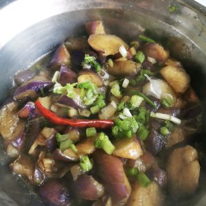 收汁关火,放入葱花,素茄子就烧好了