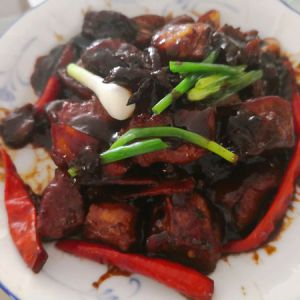 五花腩,切麻将块,不飞水直接上平底锅小火煎至金黄(转火慢了点微焦),放入大葱段、小米辣整只、姜片、红枣、蒜头和八角,浇上一大勺黄酒,加入适量水、酱油、蚝油、老抽大火烧开、小火炖煮。。。
