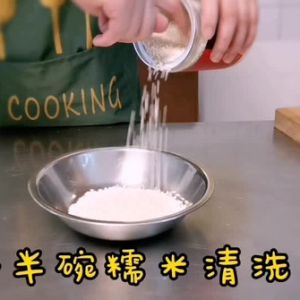糯米洗干净用水浸泡半小时。浸泡好的糯米倒掉多余水分放入蒸锅蒸至8成熟。