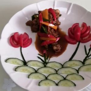 最后一步,把焖好排骨慢慢倒入摆放花边的盘子,这样作品就展现出来。