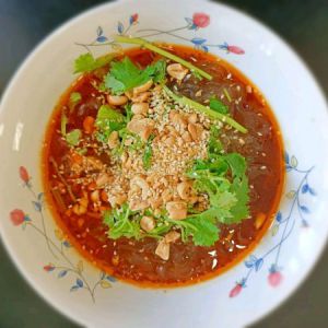 下入煮熟的红薯粉加入热水,最后撒上香菜、烤花生米、白芝麻、榨菜。