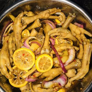 盆里装干净水提前放冰箱保鲜室冷冻,鸡爪洗干净用冷水泡一两个小时,锅里加水放几个八角,小把花椒,料酒,姜片,鸡爪一起煮,煮10分钟左右,捞出鸡爪冲凉水,剪去指甲,在掌心划刀,洗干净放入凉水中冲洗,一定要洗到完全没有热度,然后放入提前冰冻的冰水中,再放冰箱30分钟,要把肉泡的弹弹的感觉,然后拿个大碗调料,首先薄盐生抽和麻油一定要多,小米辣,姜蒜,麻油,生抽,鸡精,白糖,柠檬,花椒粉,我一盆鸡爪我要用三个柠檬,一个挤汁,两个切片,洋葱,柠檬籽一定要去掉,不然会苦,也可以加入自己喜欢的配菜一起,我加了土豆,土豆要提前戳水,弄好封保鲜膜放冰箱里,半个小时翻一次,一般一两个小时就可以了,这是我实践了多次的经验,越弄越好吃,哈哈,也可以去骨,不过我没弄。