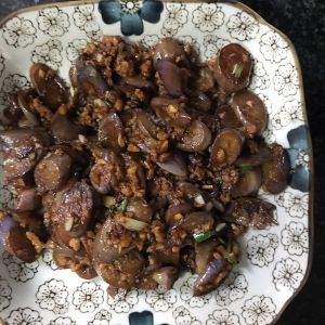 锅里放油,放入葱姜蒜末。爆香后放入肉末炒均匀,放入茄子放入老抽,酱油,料酒。出锅前放入一勺白糖