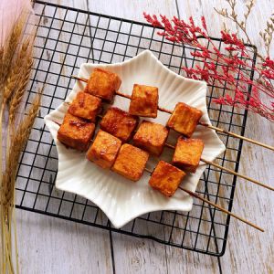 烤盘垫上油纸,竹签提前用水浸泡一下,然后把鱼豆腐串起来。