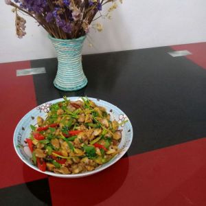 锅中油热放干辣椒丝花椒蒜片爆香后,放鲜辣椒翻炒几下后再倒入蛤蜊肉倒点料酒爆炒