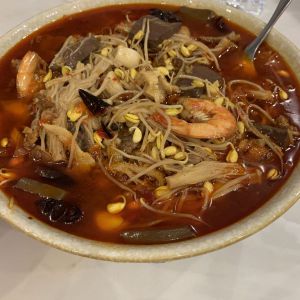 加入豆芽,虾,牛肉,鸭血,牛肚略翻炒后,加入热水和金针菇