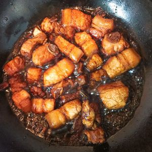 倒入老抽大火加热,待煮沸后中火直至小火,盖上盖蛮炖约半小时汤汁变稠时盛盘。