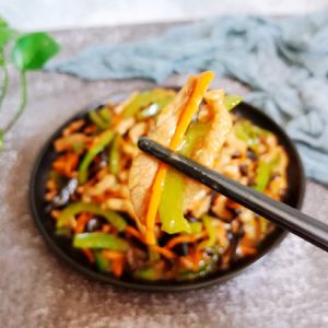 锅内留底油,倒入胡萝卜丝,木耳丝,青椒丝翻炒;