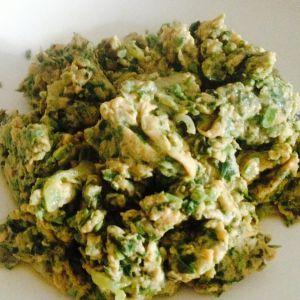 放入香椿蛋液,翻炒至半干略湿的状态时盛出,此时的口感最佳