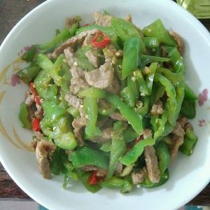 待油锅热,将肉丝放入爆炒,加入少许酱油入色,待肉丝七分熟时,将准备好的青椒丝和小辣椒倒入一起翻炒1分钟,加入盐和味精,再翻炒几下就可出锅。