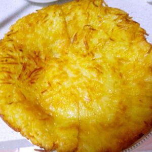 土豆丝里放盐、淀粉抓匀。煎锅烧热放油,把拌好的土豆丝倒进去,中火煎。等煎锅能晃动时把土豆饼翻一下。