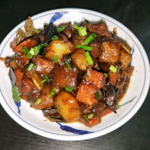 水开后,中小火焖煮至肉能轻松插入筷子,倒入切成块的胡萝卜和土豆,继续焖煮至胡萝卜土豆变软和水干