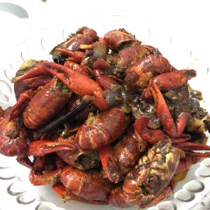 然后下姜片、蒜片,炒香后放一小把冰糖,待冰糖融化,加入半包火锅底料和一勺郫县豆瓣酱,炒出红油,等出香味了,放洋葱,炒软后放小龙虾,大火炒龙虾,(不要总翻动,虾黄会掉),待虾黄成型后,放入一点酱油,一勺蚝油,小半碗料酒,翻炒均匀。