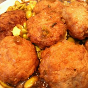 热锅后放油,就可放入手搓揉后的肉丸,油炸至两面金黄即可(因操作未能照像)。但炸肉元之前将肉元垫底的菜蔬煸炒后放入砂锅或炖锅,垫底的菜可以是青菜、白菜,我这次是用毛豆垫底。(这一步也未照像)。