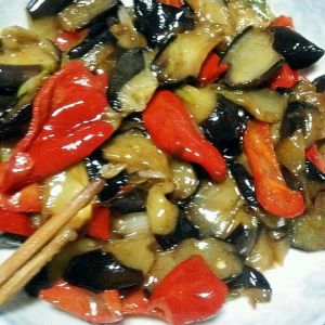 之后倒入茄子,来回翻炒,翻炒至锅内滋滋声较低或消失时,此时可以将茄子再次捞出入盘。此时向锅内加适量白砂糖或几颗冰糖,待糖融化后,将茄子沿锅边倒入锅内,翻炒。