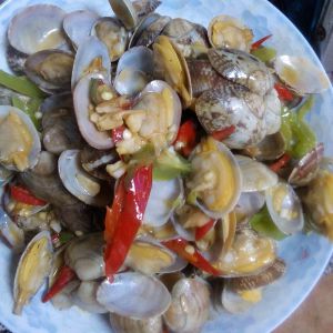 然后开始啦!把锅热好。放油烧热。然后放姜。大蒜。还有青椒。炒香。然后在放花蛤炒。放盐。料酒搅拌一下。然后放入水没过花蛤就行。然后把汁收的差不多放入酱油。出锅。享用美食
