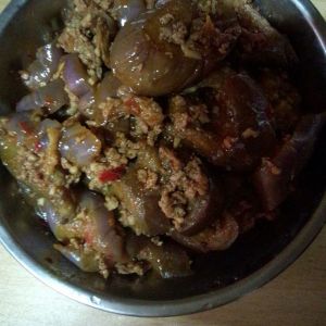 3.锅里倒入花生油,待油温升高后,放入蒜末、肉末,再加上两勺老干妈、酱油、盐少许爆炒两分钟。随后放入茄子,直到收汁后加入味精,然后出锅。