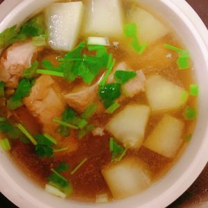 还剩十五分钟时,倒入冬瓜。最后出锅前撒盐,撒上葱花香菜,即可享用美味的靓汤啦!