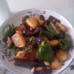 锅里放适量油烧开,倒入土豆烧至金黄,再倒入茄子,烧至茄子吐油后再倒入青椒。
