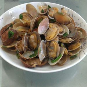 倒入花蛤翻炒,加点料酒,加点生抽,加入葱花,马上起锅。整个过程用中火或大火,时间约一分钟。