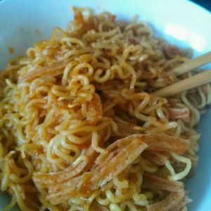 将甜辣酱 白糖 蒜瓣 香其酱 苹果片 放入搅拌机内搅拌,再用清水稀释,我这个就比较干,烤出来的方便面就比较干