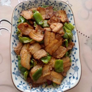 将煮好的花肉切薄片,青椒洗净掰成小块,葱姜蒜切末
