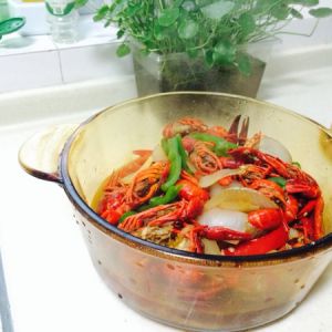 再起小油锅,依次加入姜片,大蒜,洋葱翻炒爆香,放入加工过的小龙虾。