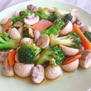 把口蘑和西蓝花倒锅里翻炒,扒拉扒拉,倒酱油,巴拉巴拉倒耗油,耗油可以不放的,我以前都不放,最近超市买东西送了几瓶耗油,所以能用就用了,继续扒拉扒拉,放香油,随意不加也行,我一直习惯炒这个菜放点香油,仅仅是习惯没有为什么,再巴拉巴拉放点盐就行了,最后水淀粉勾芡扒拉扒拉,不勾也行,勾完菜色亮,汁能裹在菜上面,差不多出勺就行了。
