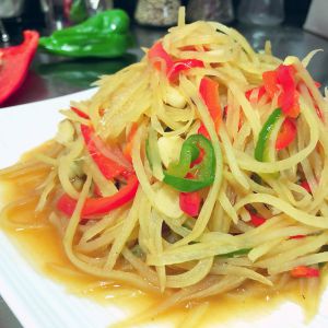 放入青红椒,蒜头,土豆丝一起炒,放盐、生抽、醋、鸡精、少许清水,两分钟后出锅。