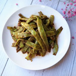 锅里放入适量的食用油,要多些,因为要将豆角过油,得保证豆角全部浸在油里,油温大约7、8成热的时候,把豆角放入油锅里炸,等豆角炸至全部变色且炸透为止,用漏勺将其捞出控油备用,