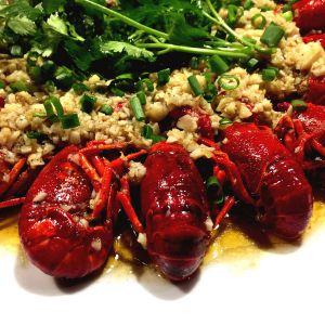 龙虾炸一下,炸好后就可以炒蒜蓉,蒜蓉炒一半,炒香变黄就可以放虾.