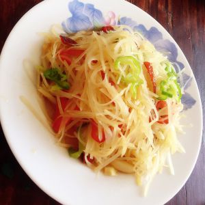 切丝备用、把蒜拍一下、下锅、出蒜香味倒入青红椒炒、再倒入土豆丝加盐和味精、出锅前倒入白醋!