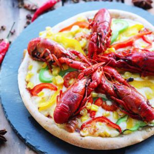 摆上彩椒丝,撒上甜玉米粒,放小龙虾肉,可以多多的放,烤好以后超好吃
