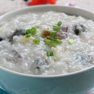 皮蛋去壳切成碎丁、菜叶洗净切碎、小葱切碎、瘦肉末用少许盐和姜片腌制片刻