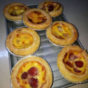 草莓与香蕉放入蛋挞皮中,搅拌均匀的蛋挞液放入蛋挞皮中8成满,200℃烤15~20分钟(根据自家烤箱温热度来定),250℃烤五分钟上色即可。