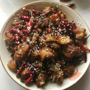 鸡肉变成金黄色,锅内倒入花椒,炒一分钟