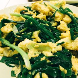 刷锅后,加入少量食用油润锅,放入韭菜,撒少量盐,大火翻炒。待韭菜变色后,放入鸡蛋,再撒少量盐翻炒几下。加入少量五香粉鸡精,翻匀即可出锅。