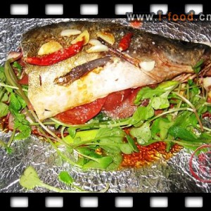 鱼先用盐,料酒喂了一会儿,鱼很长,烤箱放不进去,没办法切开了,鱼肚子里放了葱姜蒜等调料,还有西红柿,青菜,尤其放了特意买的蒸鱼豉油,