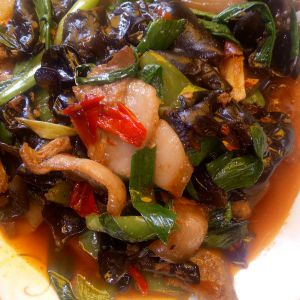 然后下木耳、蒜苗茎、青椒适量的盐、生抽、不停的翻炒至蒜苗断生、关小火、下蒜苗叶翻炒均匀、放适量的鸡精、十三香。