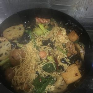 翻炒均匀后依次放入西兰花、菜花、香菇、藕片,翻炒均匀。如果怕糊锅,可适当放入少量的水。最后再放入青菜、金针菇和方便面,翻几下就可以出锅了!