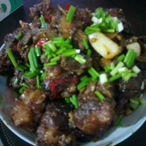 锅里放油烧热(我家用的是菜油,把泡泡烧散)放排骨炒,炒一会儿捞出放碗里,锅里留油放下冰糖炒起泡(我用的是散冰糖。小火炒,不要炒糊了)把排骨倒进去炒,辣椒,姜,蒜瓣跟着放进去炒,放点酱油炒两分钟