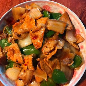 煮好的五花肉切片!锅里倒油烧热到七成把肉放进去,肉炒到肥肉出油!把豆瓣酱➕生姜➕葱花➕盐➕糖➕胡椒粉炒一分钟!