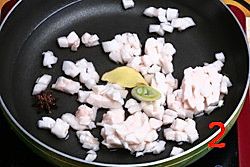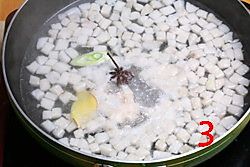 锅中放清水、放入肥肉丁、葱段、姜片、八角。