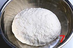 趁着晾凉油渣的时候,用清水和面,饧面10分钟。