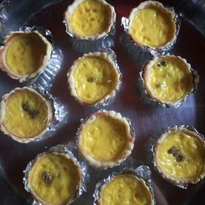 把葡萄干放进挞皮里再加入挞水,烤箱上下火230度预热十分钟,然后把蛋挞放进去烤20分钟就可以出炉啦!特别好吃哦!很脆!
