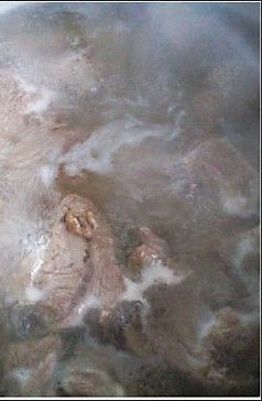锅置火上,放羊肉,加清水,大火烧开,撇去浮沫。捞出,用热水冲去肉上的浮沫。